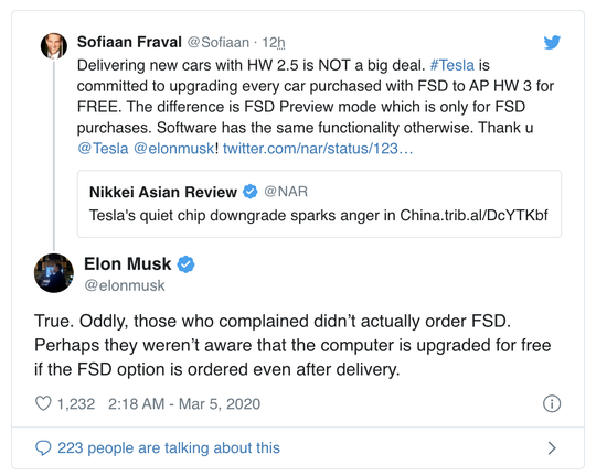 特斯拉的老板马斯克也对这场风波做出了回应,他在推特上表示:“很奇怪,那些投诉的车主实际上并没有订购FSD。他们可能并不清楚,如果在交付后又订购了FSD,那么相应的计算机硬件是可以免费升级的。”