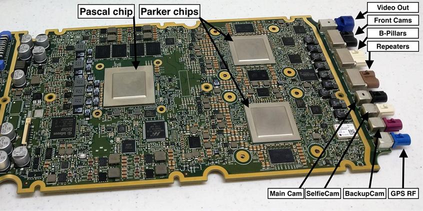 图为HW2.5的拆解图,板卡上的3个芯片均来自英伟达,包括2个Tegra Parker处理器和一个Pascal处理器 。