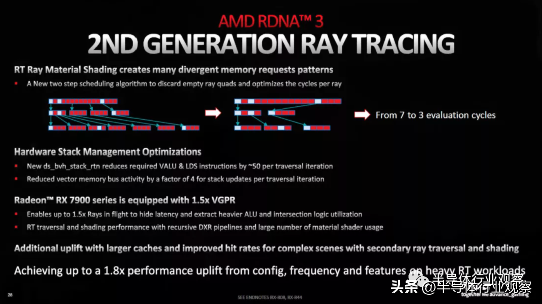 在 RDNA 3 中,AMD 为 AV1 格式添加了完整的同步编码/解码(仅在之前的 RDNA 2 中解码)。关于新媒体引擎的信息不多,除了它可以同时处理两个 H.264/H.265 流,AV1 的最大速率为 8K@60Hz。AMD 还简要提到了“AI 增强型”视频解码,但没有提供更多细节。