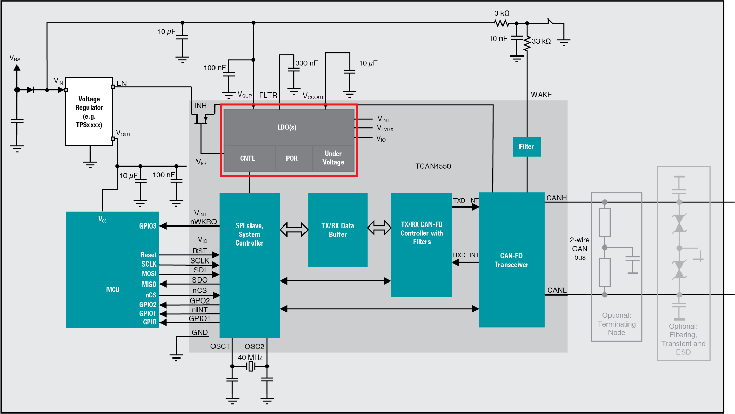 德州仪器(TI)拥有利用其标准CAN和LIN收发器系列开发出来的CAN和LIN SBC。 LIN SBC还包括上述提及的许多功能和一个125-mA LDO。