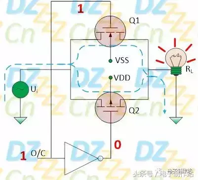 当O/C控制引脚为高电平时,Q1(PMOS)因栅-源电压VGS<VGS(ON)而导通(PMOS的导通阈值为负电压),同样,Q2(NMOS)因栅-源电压VGS>VGS(ON)而导通(NMOS的导通阈值为正电压),如下图所示: