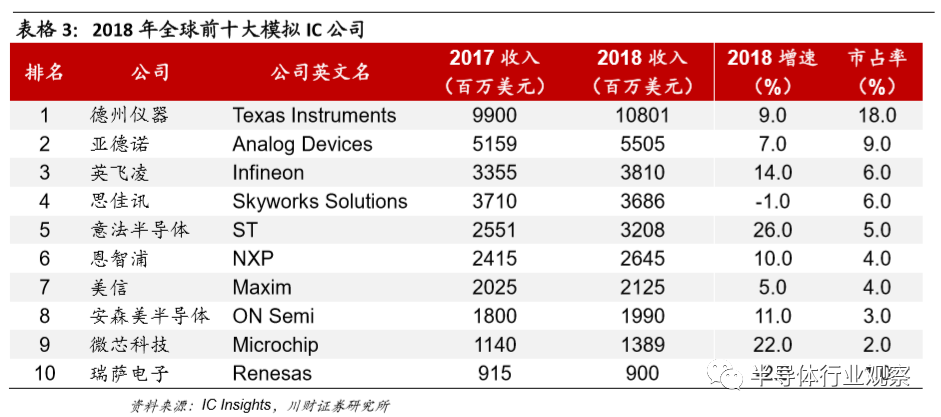表格3: 2018年全球前十大模拟IC公司