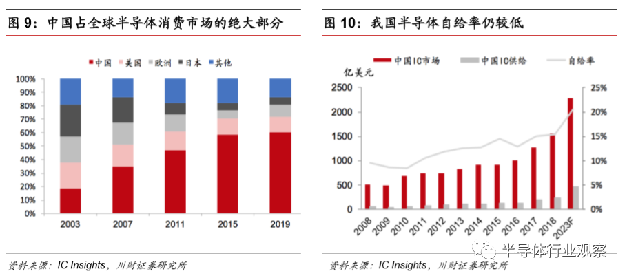 中国IC整体供不应求,模拟芯片供应商仍以国外企业为主。中国目前是全球 最大的电子产品生产及消费市场,根据IC Insights统计,从2013年到2018 年仅中国半导体集成电路市场规模就从820亿美元扩大至1550亿美元,年均 复合增长率约为13.58%。但根据海关总署的数据,仅半导体集成电路产品的进口额从2015年起已连续四年位列所有进口商品中的第一位,不断扩大的中国半导体市场依赖进口,中国半导体产业自给率较低。据ic Insights数据显 示,2018年我国半导体自给率仅为15%。