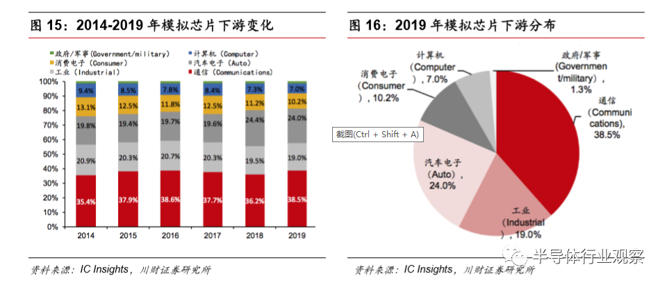 模拟IC的下游应用涵盖B端与C端,主要应用在网络通信、消费电子、汽车电子、工业控制、计算机等领域。据IC Insights数据统计,网络通信是模拟IC应用需求最广的领域,2019年预计需求占比为38.5%;应用需求在其后的依 次为汽车电子、工业控制、消费电子、计算机、政府军事,比例分别为24.0%、 19.0%、10.2%、7.0%、1.3%。
