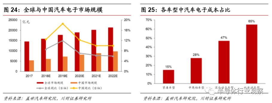 全球汽车电子市场快速增长,中国增速高于全球。自动驾驶和电动汽车以及所 有新汽车上更多电子系统的增长有望使汽车模拟设备的需求保持强劲。根据麦 肯锡预测,2020年模拟IC产品约占汽车半导体的29%,市场规模约为114.3亿美元。据WSTS统计,到2018年,汽车专用模拟市场预计将增长15%, 成为增长最快的模拟IC类别,在WSTS分类的33种IC产品类别中增长第三快。受智能驾驶升级和新能源车普及推动,至2022年,全球汽车电子市场规模有望达到2.14万亿元,较2017年增长近50%,而中国汽车电子市场规模将达到9783亿元,较2017年增长80%以上,复合增长率高于全球增速。