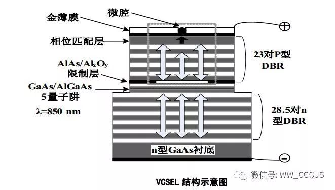 发光层上、下两边分别由四分之一发光波长厚度的高、低折射率交替的外延层形成p-DBR与n-DBR,一般要形成高反射率有两个条件,第一是高低折射率材料对数够多,第二是高低折射率材料的折射率差别越大,出射光方向可以是顶部或衬底,这主要取决于衬底材料对所发出的激光是否透明,例如940纳米激光由于砷化镓衬底不吸收940纳米的光,所以设计成衬底面发光,850纳米设计成正面发光,一般不发射光的一面的反射率在99.9%以上,发射光一面的反射率为99%,目前的AlGaAs铝镓砷结构VCSEL大部分是用高铝(90%)的Al0.9GaAs层与低铝(10%)Al0.1GaAs层交替的DBR,反射面需要30对以上的DBR(一般是30~35对才能到达99.9%反射率),出光面至少要24~25对DBR(99%反射率),由于后续需要氧化工艺来缩小谐振腔体积与出光面积,所以在接近发光层的p-DBR膜层的高铝层需要使用全铝的砷化铝AlAs材料,这样后面的氧化工艺可以比较快完成。