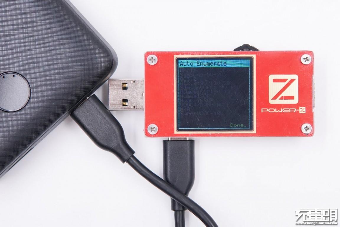 使用ChargerLAB POWER-Z KT001检测USB-A口的输出协议,显示支持Apple 2.4A、USB-DCP协议,以及QC2.0、QC3.0、Samsung-AFC、Huawei-FCP快充协议。