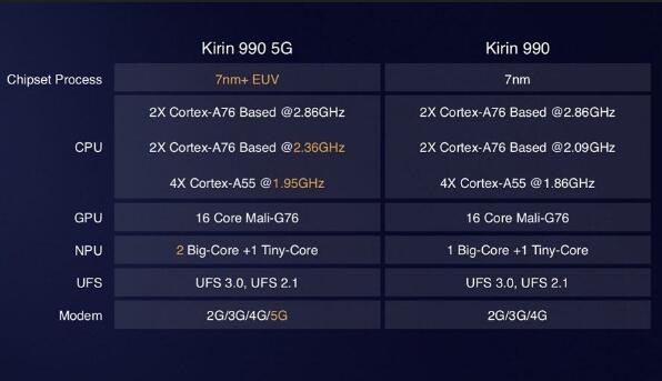 麒麟990 5G的阉割版,相比于麒麟990 5G,麒麟990E在GPU核心数量方面有所不同,从麒麟990 5G的16核心缩减为14核心,NPU芯片也阉割了一颗大核心,其他方面则完全一致。
