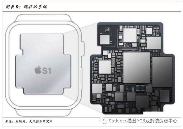 稳坐全球可穿戴设备数量首位的苹果就是坚定看好SiP应用的公司,也可以说是将SiP带“火”的公司。早在2015年第一代AppleWatch中,苹果就开始采用了SiP工艺,将CPU、存储、WiFi、触控、音频等30多个独立组件,20多个芯片,8000多个元器件都集成在1mm厚度的狭小空间内。