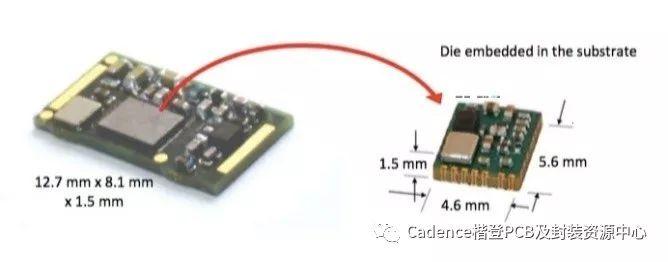 Microsemi已将芯片嵌入到基板中,与之前的版本相比,面积减少了400%。它具有很高的可靠性,符合植入式元件的MIL标准。这种方法也适用于其他需要高可靠性的环境,如航空航天、汽车和工业传感领域。在此举一个改进示例——超薄嵌入式芯片,其叠层厚度为0.5mm,模块总高度约为1mm(这是分立元件的极限)。