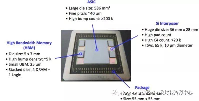 AMD的图形处理器用作硅中介层和硅通孔。它在1.011mm2的中介层中心安装了一个595mm2的专用集成电路(ASIC),这个ASIC周围有四个高带宽存储器(HBM)叠层(每个叠层由一个逻辑芯片和四个堆叠在顶部的动态随机存取存储器(DRAM)芯片组成)。互连超过200,000个,包括铜柱凸块和C4凸块。中介层有65,000个直径为10um的硅通孔。