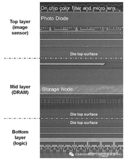 索尼已在三层堆叠结构上更进一步。顶部是图像传感器,中间是DRAM层,底部是ISP(图像信号处理器)。来自图像传感器的信号实际上直接通过DRAM层到达处理器,然后返回存储器。这是第一个使用晶圆接合的商业化三层堆叠结构。实际上,它用在了一款高端手机上,即索尼Experia XZ,这款手机于2017年2月在MWC(世界移动通信大会)大会上推出。图像传感器和(DRAM)的厚度减薄到了2.6um!几十年前,这是晶体管的大小。
