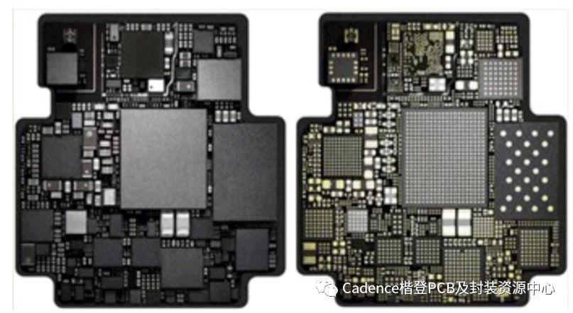 苹果手表应用的技术最为先进。在尺寸26mm x 28mm的封装中含有许多器件。手表对尺寸的严格约束意味着不使用SiP技术就不可能构建整个系统。下图是苹果手表的电路板,可以更清晰的了解该级别的设计: