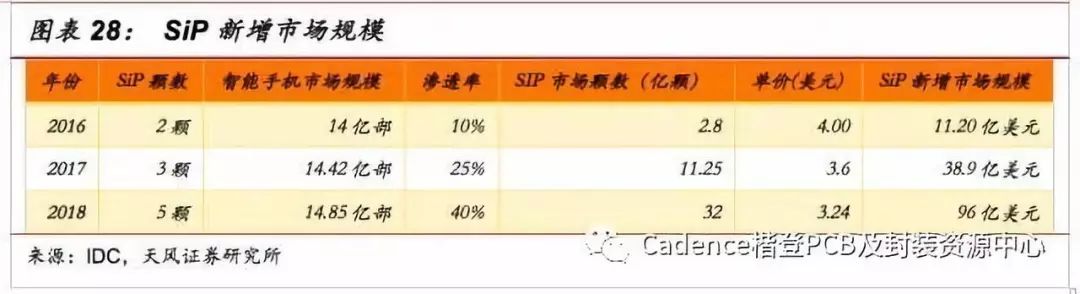 以2016-2018年为周期,我们来计算SiP在智能手机市场三年内的市场规模。假设SiP的单价每年降价10%,智能手机出货量年增3%。可以看到,SiP在智能手机中的新增市场规模的复合年均增长率为192%, 非常可观。