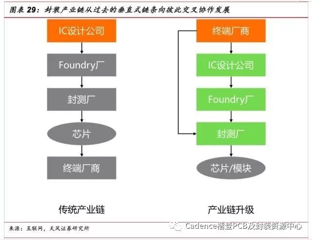 从产业链的变革、产业格局的变化来看,今后电子产业链将不再只是传统的垂直式链条:终端设备厂商——IC设计公司——封测厂商、Foundry厂、IP设计公司,产品的设计将同时调动封装厂商、基板厂商、材料厂、IC设计公司、系统厂商、Foundry厂、器件厂商(如TDK、村田)、存储大厂(如三星)等彼此交叉协作,共同实现产业升级。未来系统将带动封装业进一步发展,反之高端封装也将推动系统终端繁荣。未来系统厂商与封装厂的直接对接将会越来越多,而IC设计公司则将可能向IP设计或者直接出售晶圆两个方向去发展。