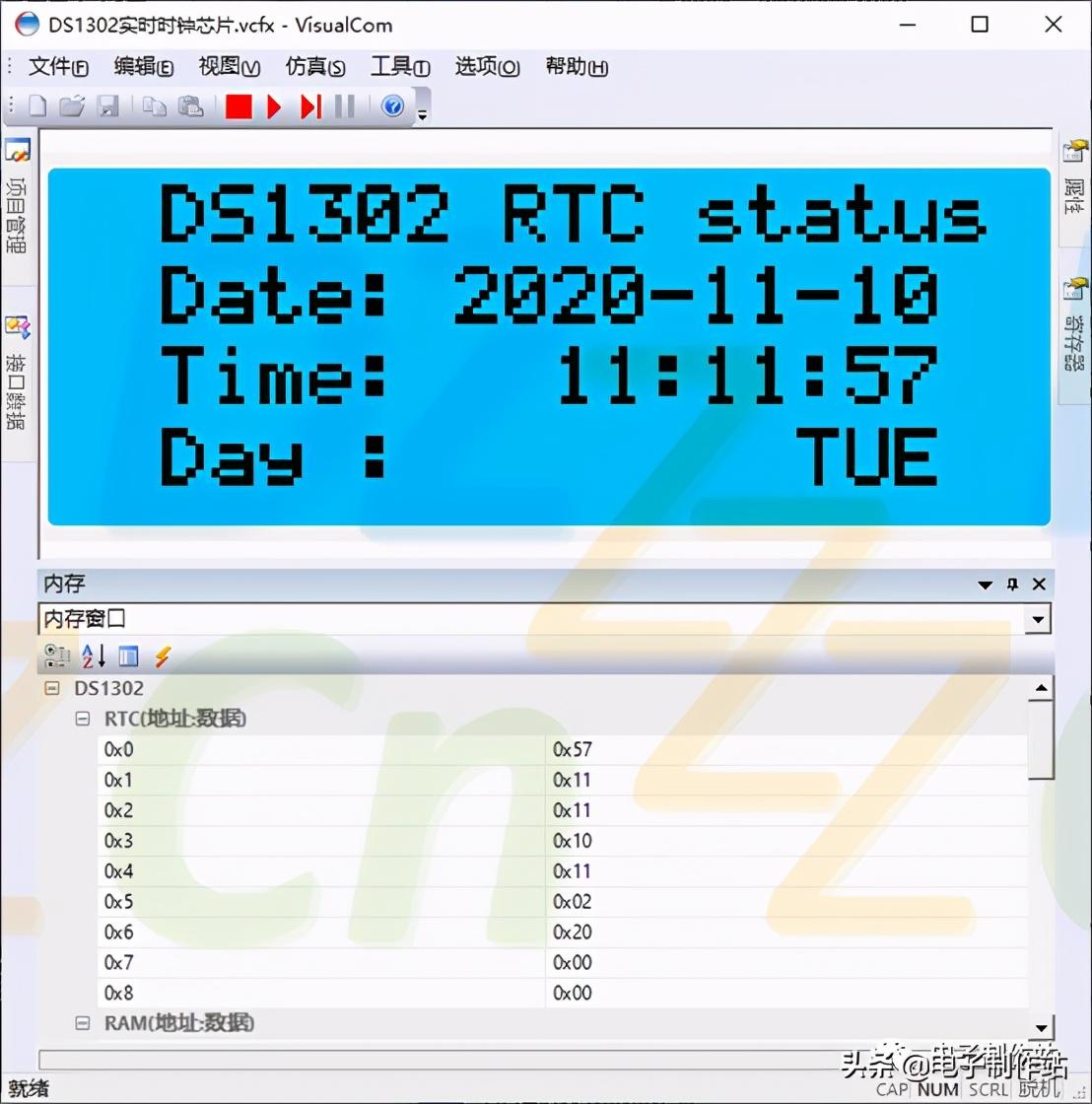 调出的DS1302器件有一个能够方便我们观察RTC内部状态的屏幕,其实就是一块能够显示4行20个字符的液晶显示模组(LCM2004),从屏幕上看到信息就是从DS1302中读取出来并写入到LCM2004中的。当然,一些特殊的寄存器状态还是得观察“内存”窗口,相应的预置数据如下图所示: