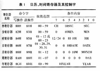 DS1302有12个寄存器,其中有7个寄存器与日历、时钟相关,存放的数据位为BCD码形式,其日历、时间寄存器及其控制字见表1。