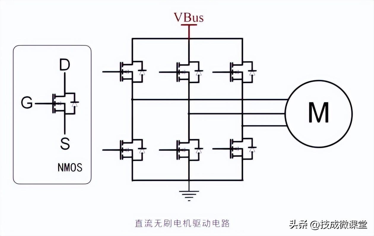 对于高边MOS,其源极(S)接到电机相线,其电压是不确定的,如果需要开通,需要通过自举电路提供栅极电压,驱动较复杂。