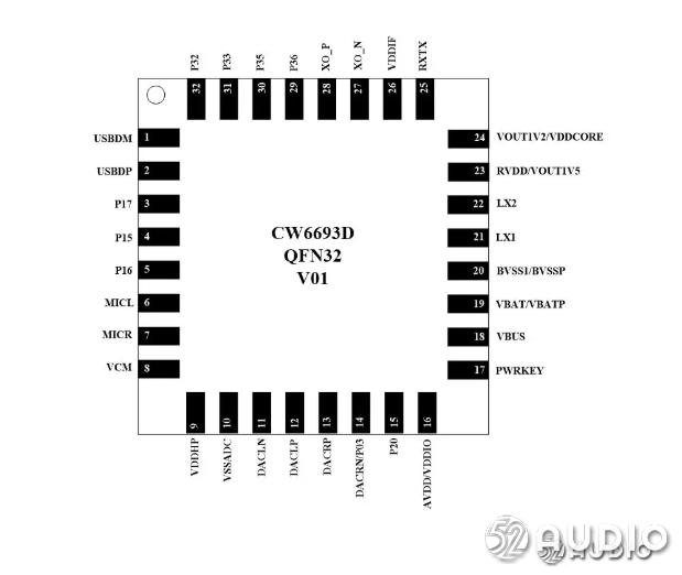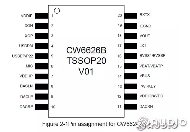建荣 CW6626B内建LDO,降压DC-DC,电池充电。采用TSSOP20封装。支持电池电压2.7-4.25V,充电输入电压4.75-5.75V,内置通话音频改善算法,内建浮点处理器,内置135K SRAM,内建4M FLASH。