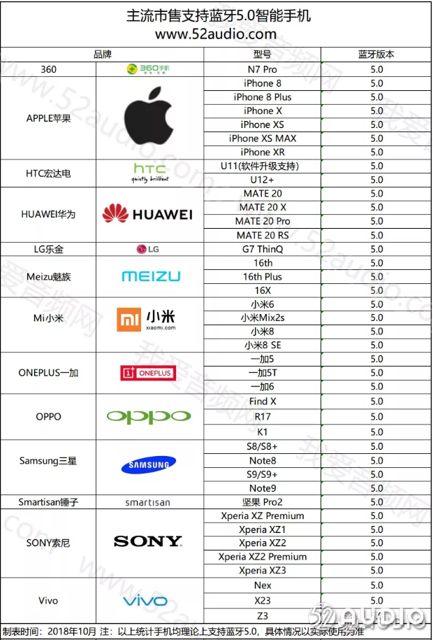 从最开始的蓝牙4.0、4.2,目前市场上的芯片产品已全面更新至蓝牙5.0,手机做为最主要的传输设备当然也紧跟步伐,首先让我们先来了解一下,目前市场上已经支持蓝牙5.0的手机设备。