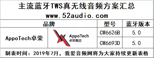 我爱音频网获悉,AppoTech卓荣已推出两款TWS真无线蓝牙耳机方案是CW6626B和CW6693D。