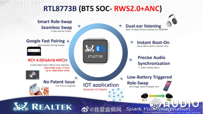 瑞昱RTL8773B支持数字混响ANC,降噪效果最高可达40Db;Hybrid ANC打开时功耗消耗低于1Ma;支持充电盒内随取随用与无缝主从切换,仅需配对一次双耳机即可无缝切换。