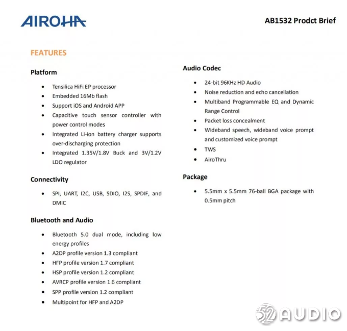 Airoha络达最新低功耗芯片AB1532支持蓝牙5.0+EDR.内置高性能DSP,支持High-Res 高分辨率音乐,高中低频自动补偿。支持多MIC,多种外设接口,方便调节敲击/触摸/光感 sensor。