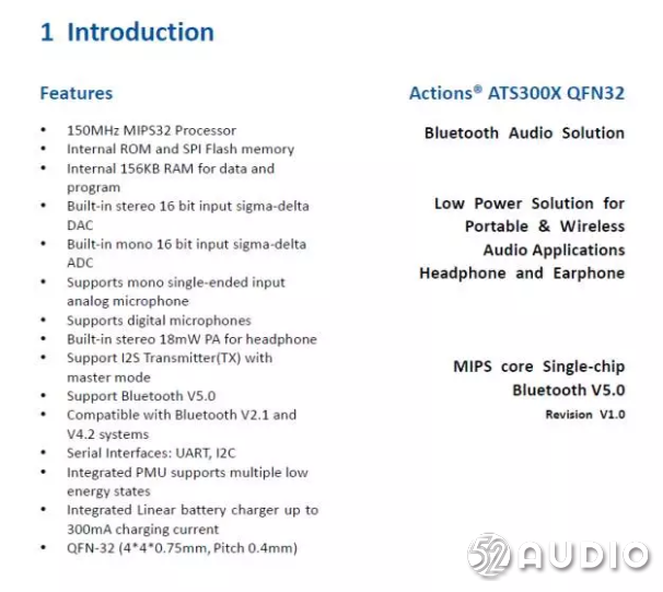 Actions 炬芯ATS300X 系列新品内置150MHz MIPS32处理器,支持数字麦克风和模拟麦克风输入,内置18mW的立体声耳机放大器,支持蓝牙V5.0,并且兼容蓝牙V2.1~V4.2。