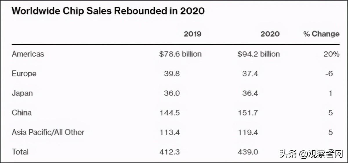 2019、2020年世界主要国家和地区芯片销售额 图片来源:彭博社