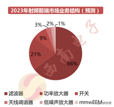 滤波器是射频前端市场中最大的业务板块,占比约54%,并且随着通信频段的增加,其份额将进一步提高,到2021年将达到66%;功率放大器是射频前端市场中的第二大业务板块,占比34%;射频开关占比约7%,天线调谐器及其他占比约5%。