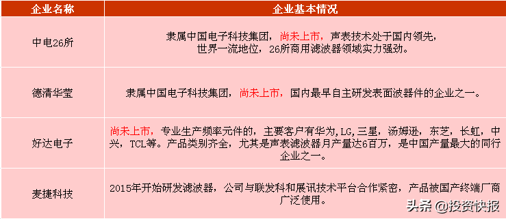 射频滤波器的作用是保留特定频段内的信号,将特定频段外的信号滤除,从而提高信号的抗干扰性及信噪比。目前,我国国产有以下机构企业的产品处于国内领先位置: