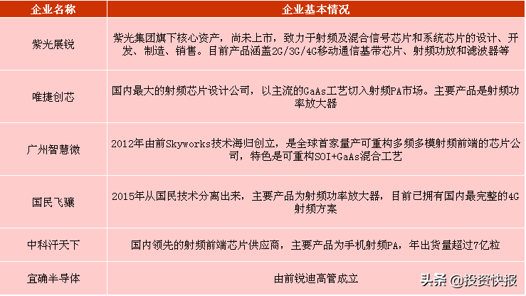 好达电子、唯捷创芯、飞骧科技、国博电子,已经上市的射频芯片企业有卓胜微、麦捷科技、信维通信、旷达科技(芯投微)等。射频芯片指的就是将无线电信号通信转...
