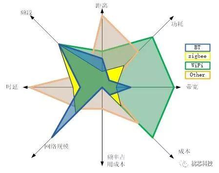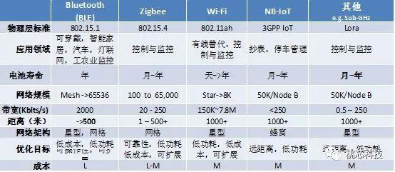 功耗: 在功耗表现方面BLE是最好的,市场上最好的指标是:RTC休眠(不是shutdown,很多时候会有意或无意的去混淆这个)的时候1uA左右,这个值已经基本上是由PMU,pad等半导体的物理特性决定了的,一般来说很难再小了。Active时候的峰值基本在十毫安以下;而500ms广播的平均电流在30uA。WiFi基本上是10倍数量级的高于这个数值,这个也是比较基本的判断。NB,Lora,Sigfox的功耗基本介于这两者之间,这几种无线协议解决待机时间的方法是增加收发间隔和低速率。速率: BLE是2Mbps,可以做透传,做BLE的profile应用,音频等。WiFi目前用在物联网作为连接功能的基本都是802.11b(物联网的802.11ah协议基本没有应用),所以最高速率在10Mbps左右,WiFi是为数据而生的协议,目前用在控制方面的应用,传输能力比较鸡肋。其他的Zigbee,NB,Lora,Sigfox都在250Kbps左右,这类协议基本只能做极小数据的透传,不能像BLE一样还能做一些应用。传输距离: BLE5具备长距离特性,室内50米左右,相比WiFi在高功率发射的情况下表现还要好。Zigbee同BT4.2之前的水平差不多,应该在室内10几米或者再多一点。NB,Lora,Sigfox属于广域的协议,传输距离都在1000米以上。组网能力: BLE的Mesh组网理论上65000,实际上目前可能测试到几百上千个节点(有智能灯具10000个点的记录)。Mesh组网的特点是网络节点平等,网络内部的采集和控制可以网内消化,而需要上云端的数据可以通过网关(比如智能音箱或任意一个Proxy节点)或手机传输。WiFi的组网是星型的,由路由器周围带十几或几十个节点,对大规模组网来说并不友好,这也是业界通常的看法。Zigbee本来就是做工业互联的,开始便具备组网能力,它的弱点在于需要唯一网关上网,所有网络规模大不了,通常100-200个点,而且还需要配备专门的路由器。其他NB,Lora,Sigfox等都是星型的基站结构,或大或小,看基站的能力以及协议规格,目前看来都是几K或小几十K。成本: 成本难以直接比较,同一种协议的不同芯片规格,成本相差也比较大。BLE的成本相比其他任何一种协议,如果在相同的高中低档芯片平行比较的话,是最小的。从市面上总体的感觉,也能得出这样的结论。市场规模: 目前单单BLE的市场规模,不包括音频的话,也有将近20亿片每年,而且BLE这块的复合增长率保持在20%以上。是个数百亿级的市场(芯片only)。WiFi我这里没有数据,单仅仅从作为连接使用的11b的角度来看,比BLE小很多。而Zigbee从2002年联盟成立到现在,尚未形成规模市场,根据市场研调公司ON World所做研究,截至2018年8月,Zigbee芯片组出货量累计才达5亿颗。物联网无线协议对比