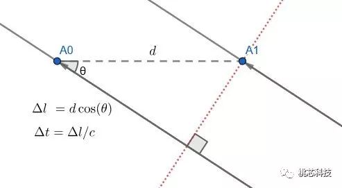 如图,基站蓝牙芯片的A0,A1两个天线,对应于被测蓝牙设备发射到来的无线电波,达到的时间是不同的,那么到达时候两个电波的相位是不一样的。结合两个天线之间已知的距离和两个天线接收到的电波相位,即可算出蓝牙发射设备的入射角。