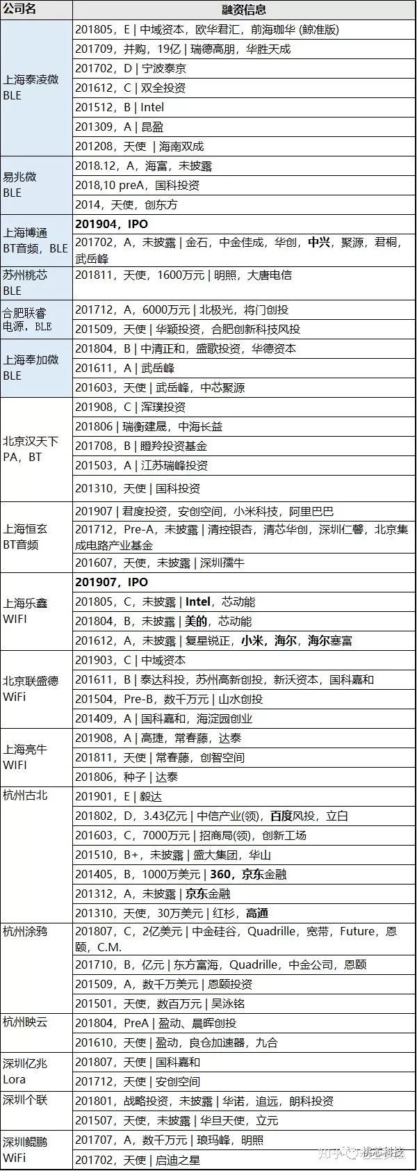 下图整理了有关蓝牙,WiFi的芯片和方案公司的情况。可以看到物联网产业蓬勃发展。国内物联网领域,从芯片到方案已经有一系列的公司参与其中,我们相信很快的,国产芯片就会迎来属于自己的春天。