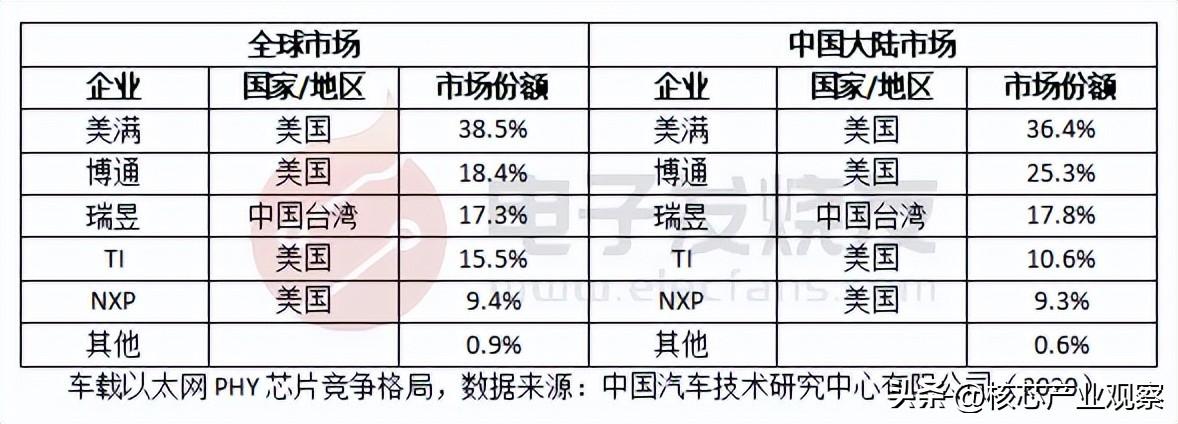 不论是非车载以太网PHY芯片的市场格局还是车载以太网PHY芯片的市场格局,集中度都很高,少数厂商掌握了大部分的市场份额。根据中国汽车技术研究中心有限公司的数据,美国博通、美满电子、德州仪器、高通、微芯和中国台湾瑞昱这几家巨头占据全球超过90%的市场份额。车载以太网PHY芯片上,美满、博通、瑞昱、TI和NXP五家企业几乎占据了车载全部的市场份额。这些家厂商经过多年发展,凭借资金、技术、客户资源、品牌等方面的积累,形成了巨大的领先优势,尤其是博通、美满和瑞昱。