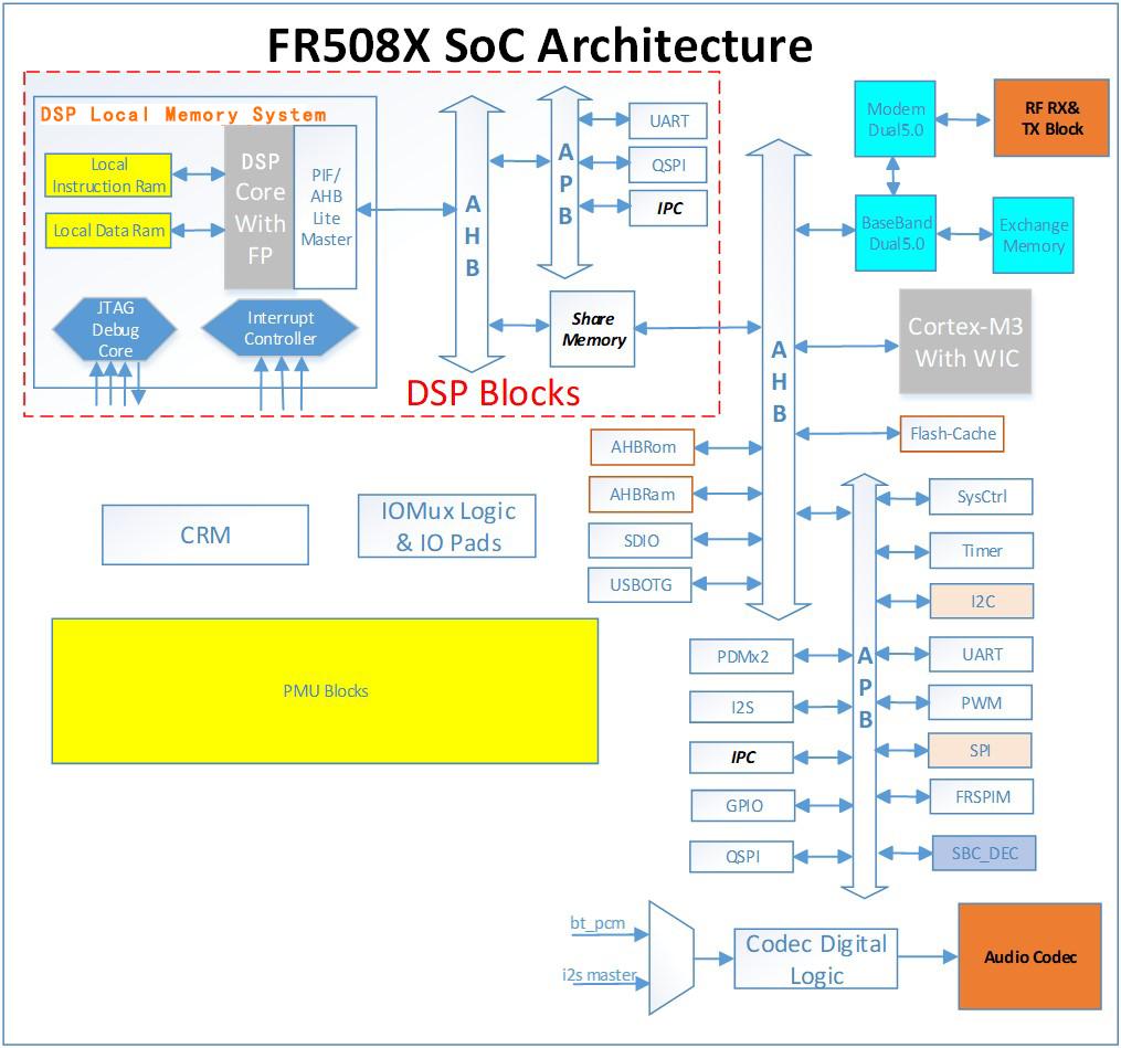 当前,富芮坤FR508x系列主推产品有FR5082DM和FR5086D,从SoC框架图来看,它具备富芮坤的传统特色,集成了Audio CODEC和PMU——这是该公司差异化竞争的体现。黎传礼此前曾谈到过,更全面的定义、强调连接性和低功耗,对客户而言意味着节省开发时间成本、降低开发难度,并提高产品竞争力。