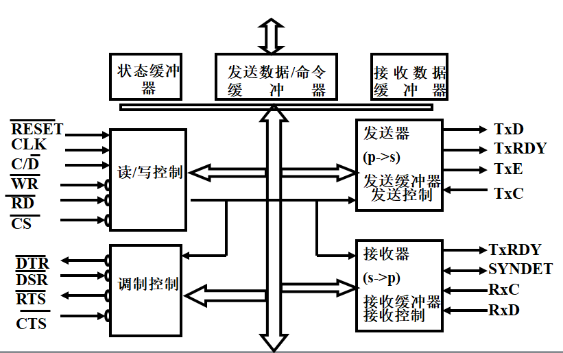 ①TxRDY(Transmitter Ready):发送器准备好,高电平有效。如果该信号有效,就表示发送缓冲器已空,通知CPU可以向芯片送入新的数据。