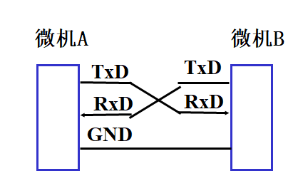 上面两个图比较复杂,也似乎很难记住。其实,对于串口通信芯片,最关键的就是每块芯片有一根发送信号线和一根接收信号线,两块8251连接如图所示: