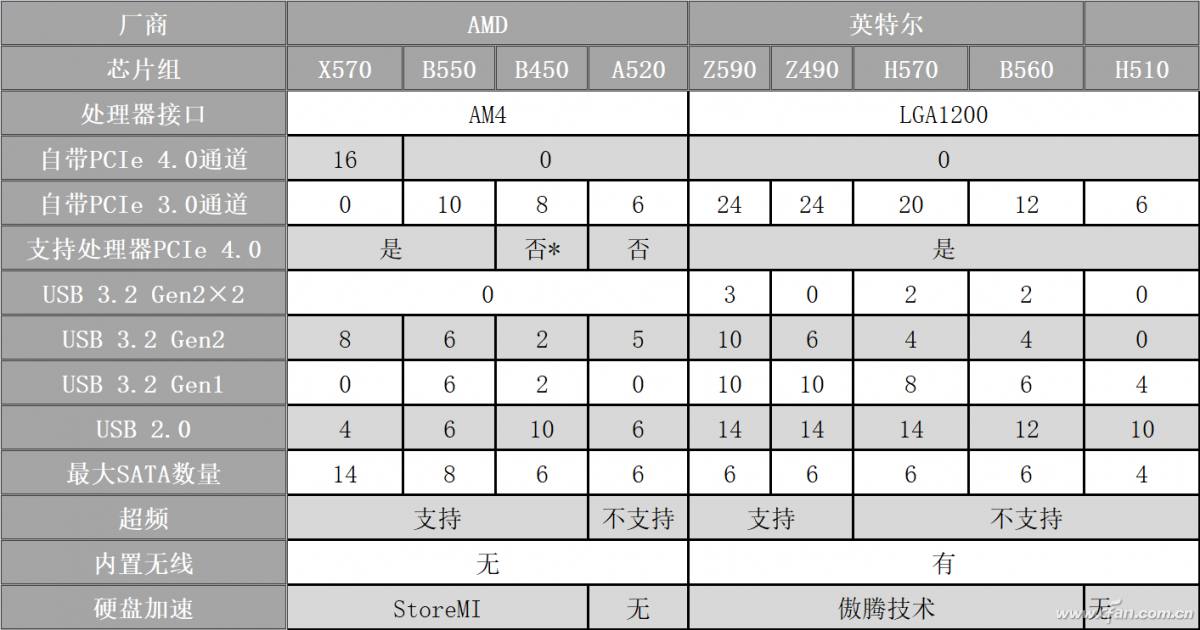 除了两个平台的最新500系列芯片组外,我们还选取了兼容新一代处理器的AMD B450、英特尔Z490这两款产品进行参考。此外,芯片组的USB、SATA等接口数量指标都是芯片组可以支持的理论最大数量,实际由于一些接口需要共用总线通道,加上主板和I/O接口面积的限制,大部分主板都不会提供足额的数量。
