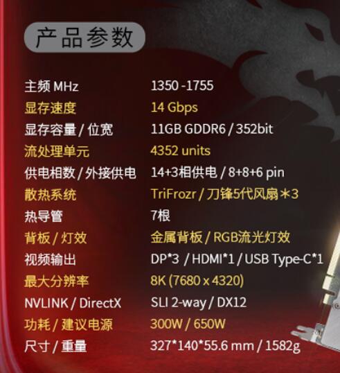 第四是温度。温度也是需要重点注意的,很多优秀的显卡都被温度这一难关卡住,出现因撞温度墙而导致降频的问题,解释一下是GPU扛不住高温而降低频率的而采取的自我保护功能,其实再简单一点就是散热好显卡性能更稳定。所以在这里笔者推荐小白玩家入手显卡的时候优先选择双风扇甚至三风扇的显卡,同时在电商的详细信息中会有介绍散热规格,风扇数相同的情况下热管多的总归散热不会差到哪去。