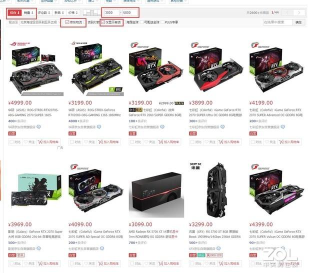 那么就以笔者自己举例,首先,要明确自己的需求,笔者预算为3000-5000元价位段,需要在2K画质下运行高画质3A大作。那么首先打开京东填好条件搜索显卡,选择京东自营产品和价格区间。