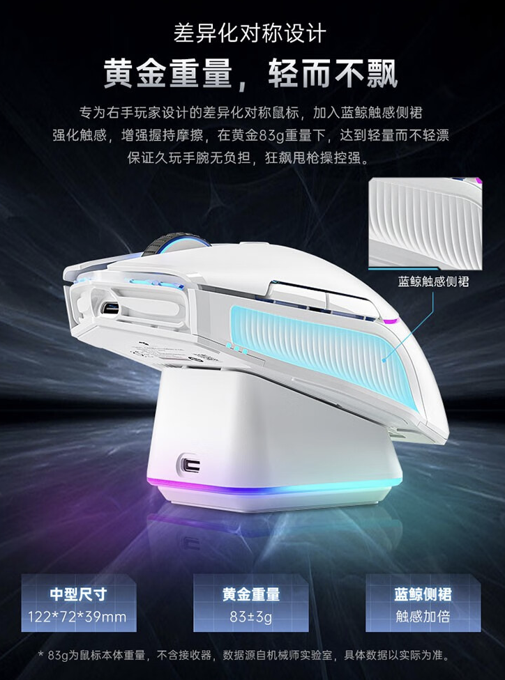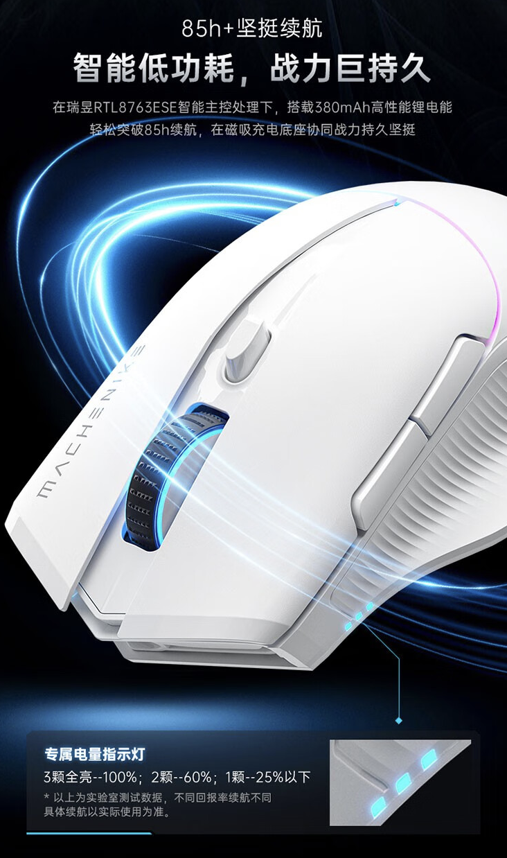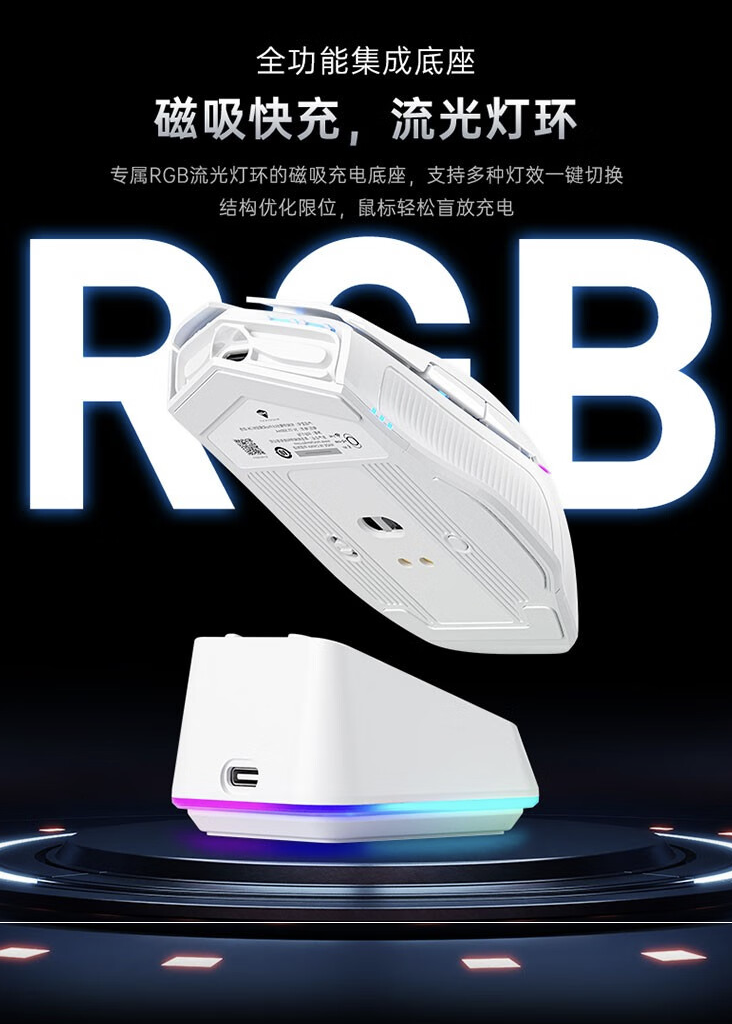 此外,这款鼠标配备 RGB 磁吸快充,支持鼠标盲放充电,鼠标本体配备 380 毫安时电池,续航 85 小时,并拥有 LED 电量显示灯。