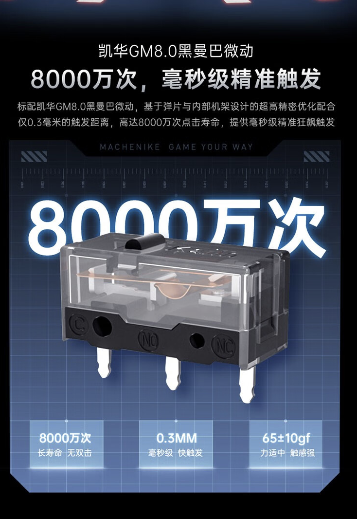 官方介绍称,这款 L8pro 三模游戏鼠标重量为 83 克,配备双触觉滚轮,拥有“齿轮段落模式”、“飞梭顺滑模式”,支持“无线 2000Hz、有线 8000 Hz”刷新率,微动寿命 8000 万次(凯华黑曼巴)。