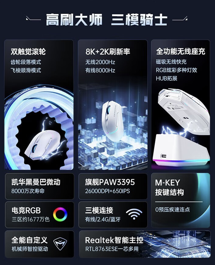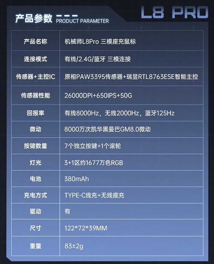 机械师上架L8 Pro三模座充鼠标:原相3395芯片,售299元
