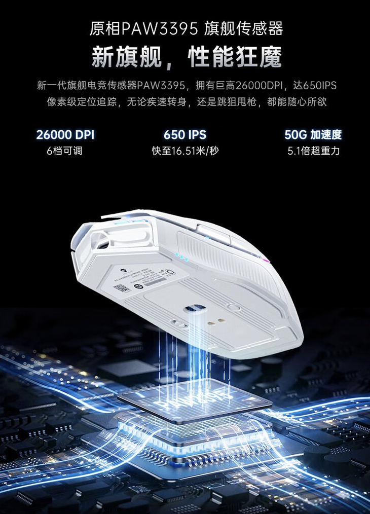 官方强调,这款鼠标配备原相 PAW3395 传感器,支持 26000 DPI,定位追踪 650 IPS。