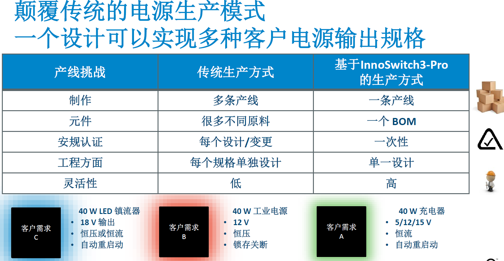 阎金光认为,InnoSwitch3-Pro将会颠覆传统的电源生产模式,因为利用InnoSwitch3-Pro,一个设计就可以实现多种电源输出规格,可以帮助客户减少研发成本;不需要重复的安规认证;在获得更快的客户响应时间的同时能够降低库存和管理费用。