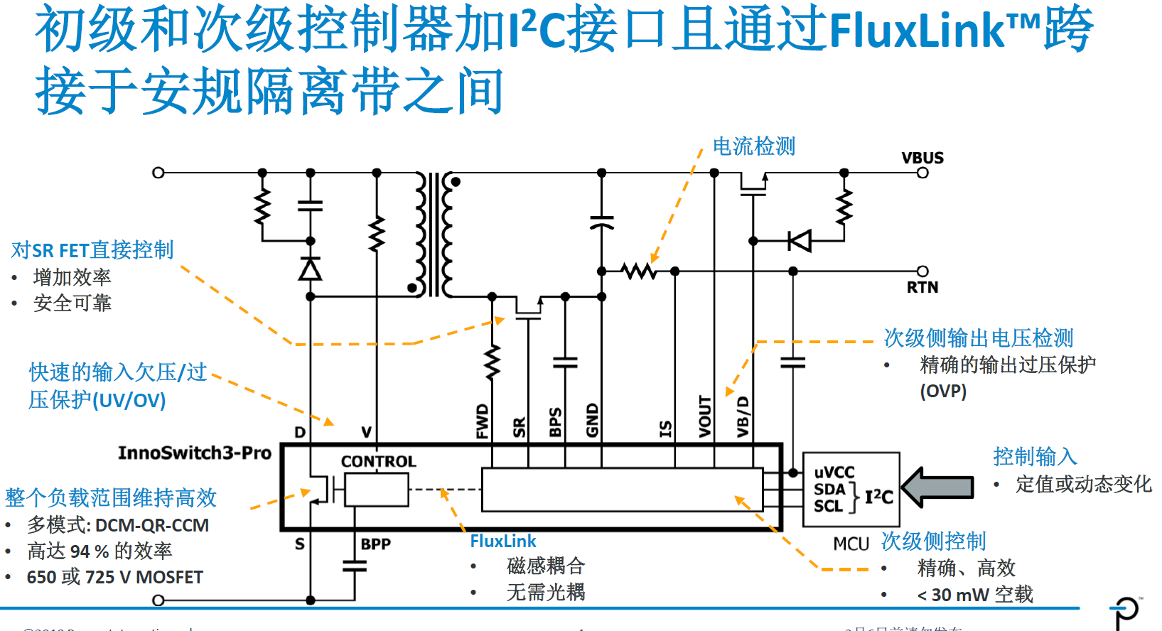 图1:InnoSwitch3-Pro增加了I2C接口,且依然采用了PI特有的FluxLink磁感耦合技术。