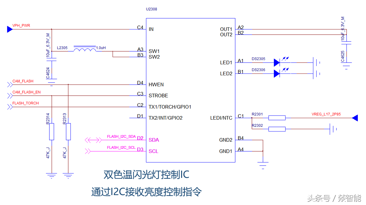 对于如果我需要在一根I2C总线上挂载多个相同的外设呢?例如上面的一组I2C控制几个灯控IC。这种情况下,IC厂家通常都会未卜先知,知道大家可能会一口气用好几个,在IC上预留地址脚 ,通过不同的拉高和拉低的状态,把设备的I2C的地址配置成不同的值。