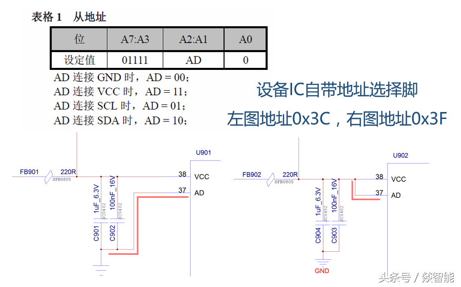 通过地址选择脚,选择不同的I2C地址
